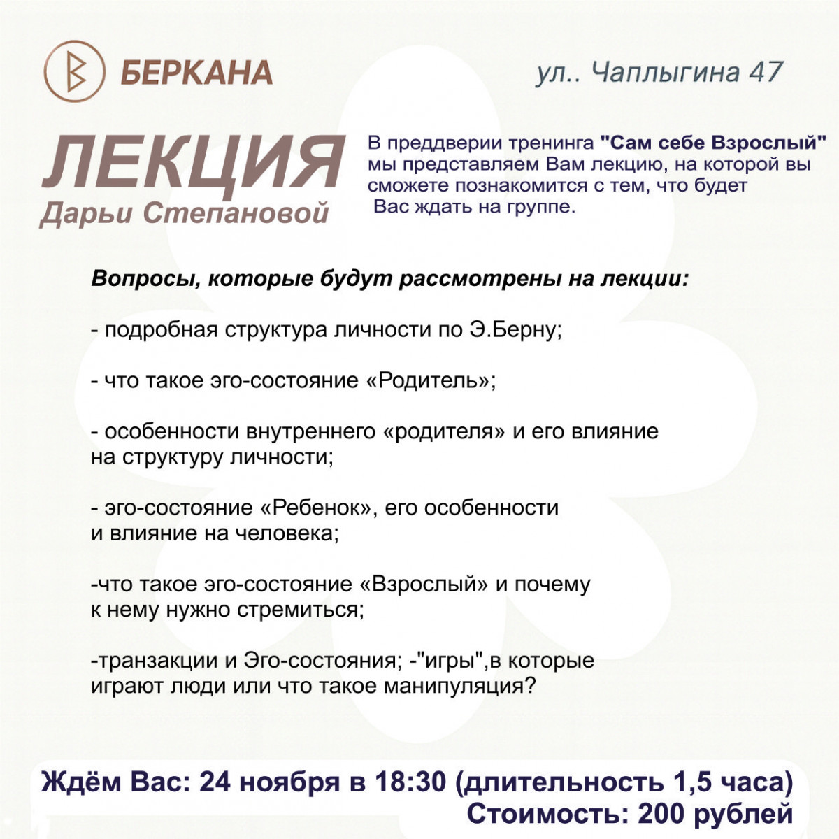 В преддверии тренинга "Сам себе Взрослый" мы представляем Вам лекцию,на которой вы сможете познакомится с тем,что будет Вас ждать на группе.